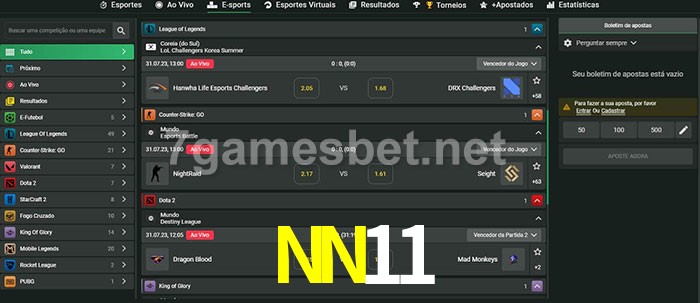 O NN11 oferece uma grande seleção de opções de apostas em e-sports com probabilidades competitivas